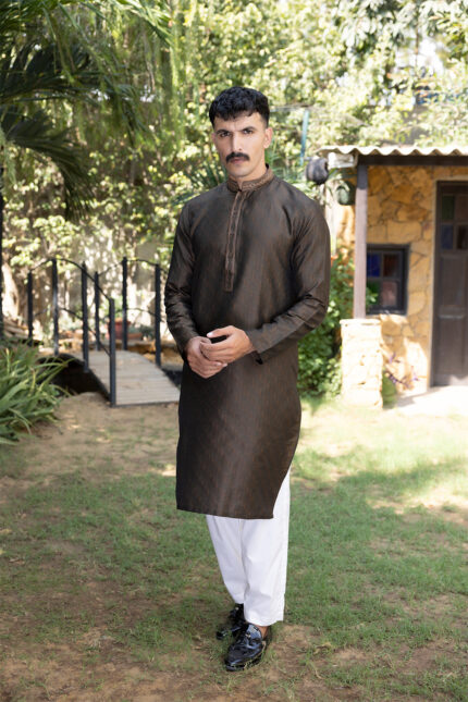 Uplift your seasonal look with our Copper Brown embroidered cotton jacquard kurta Fabric : JacquardColor : Copper Brown Additional : Collar Patti