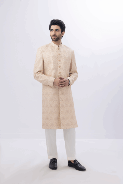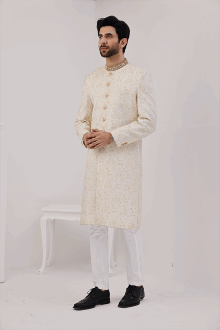 Fabric : exclusive embroidery fabric Color : CreameProduct Category : SherwaniAdditional : Hand embroidery at collar button sleeves with applique with