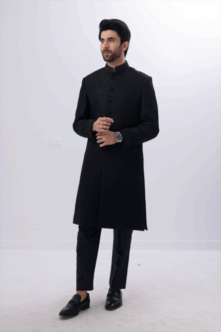 Fabric : Bxclusive embroidery fabric Color : BlackProduct Category : SherwaniAdditional : Hand embroidery at collar button sleeves with applique with