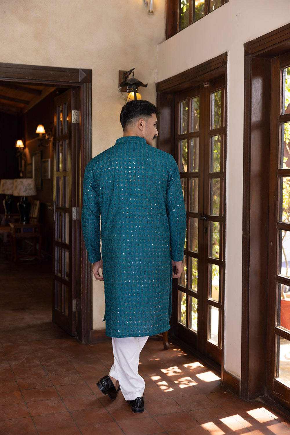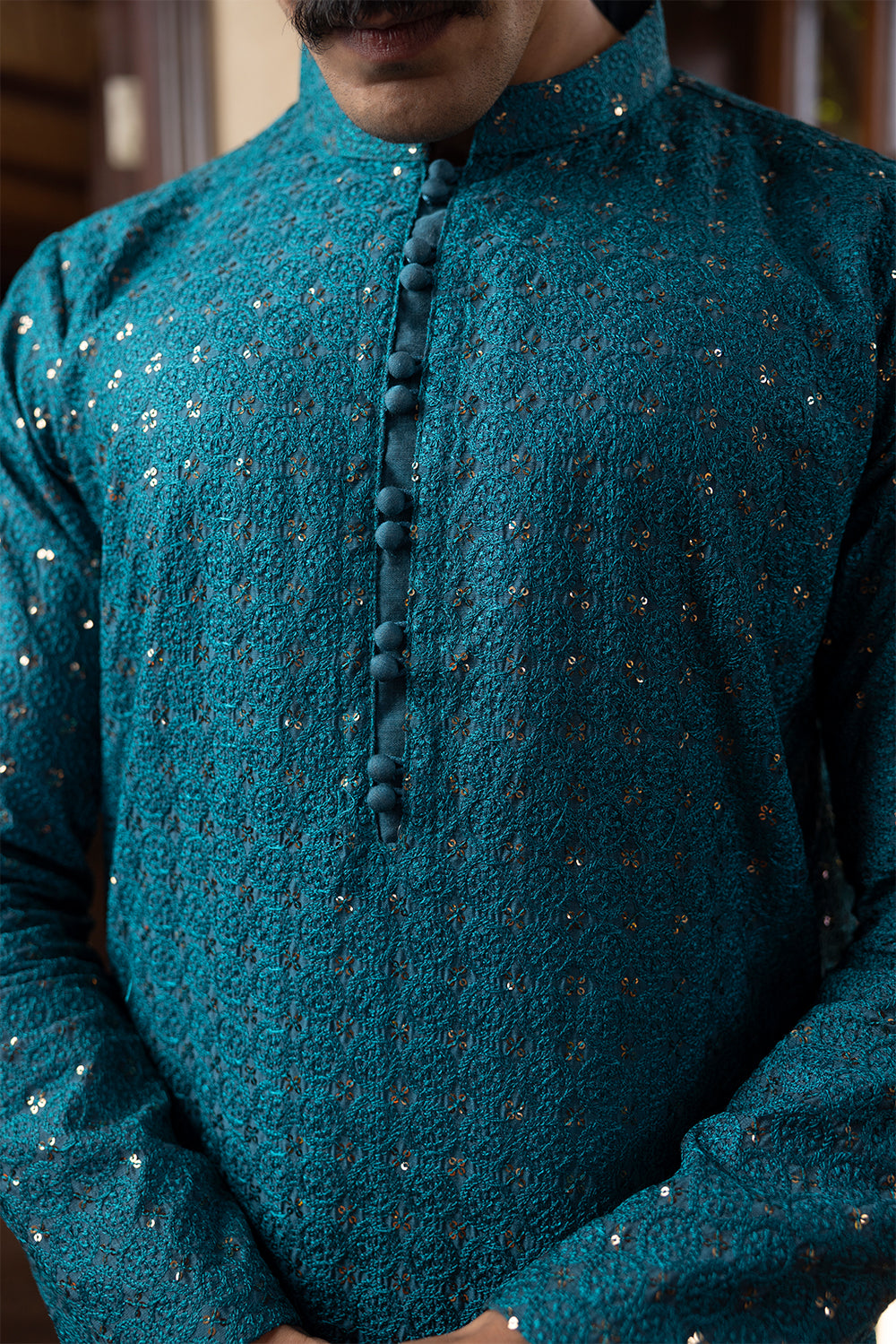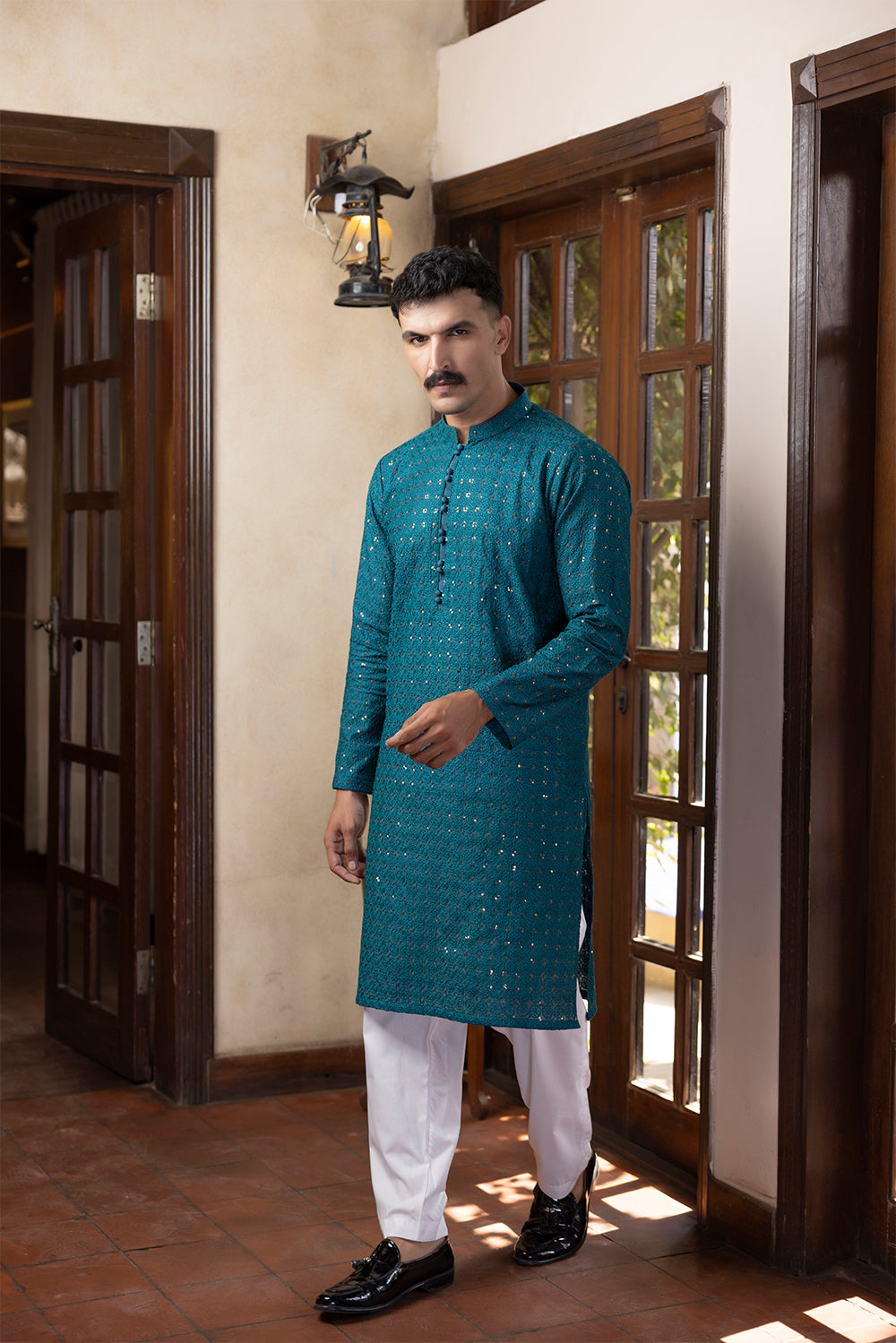 Men Mirror Work Kurta, Embroidered Kurta Set For Mens, Indian Chickenkari Teal Kurta Pyjama, Sequence Work Kurta, Traditional Suits