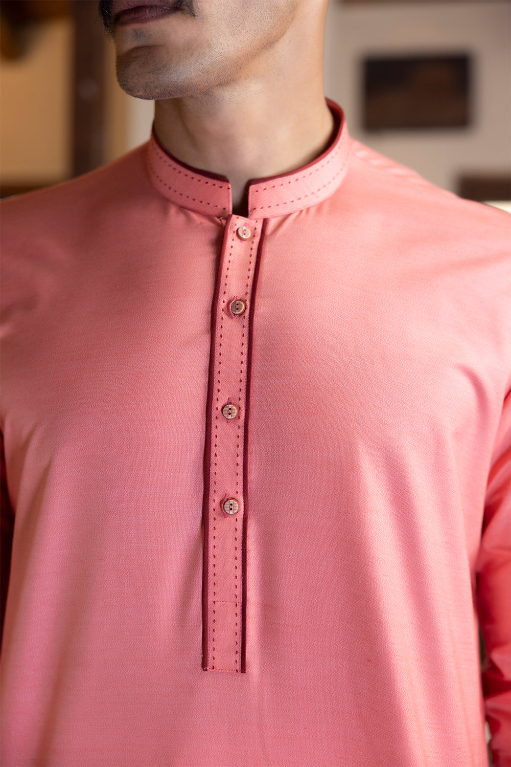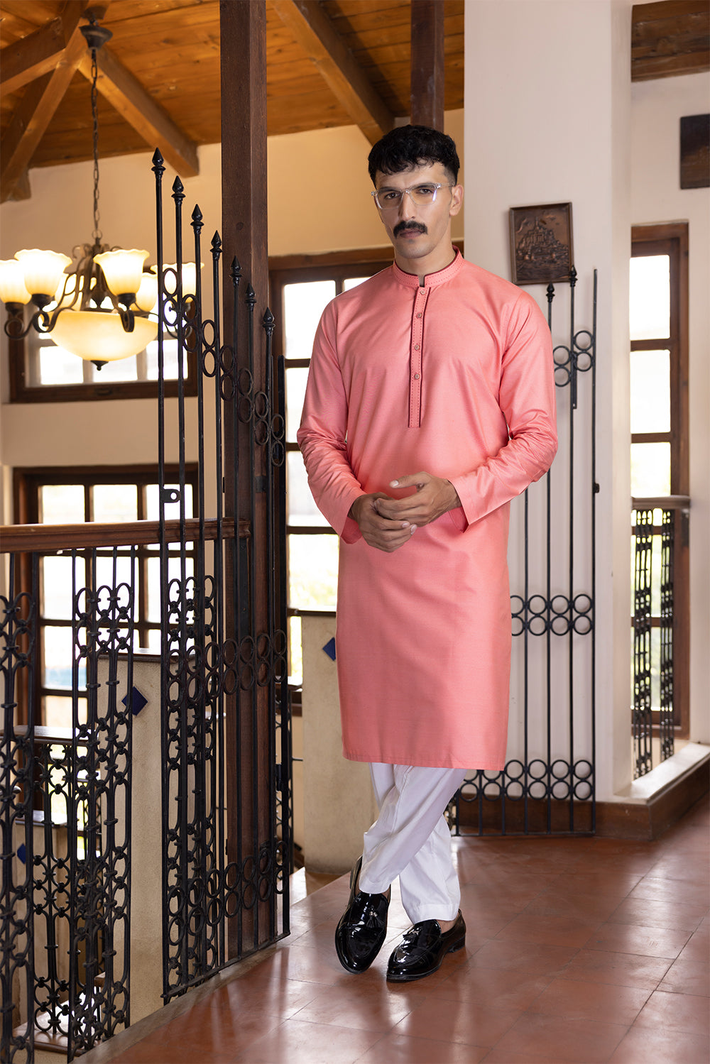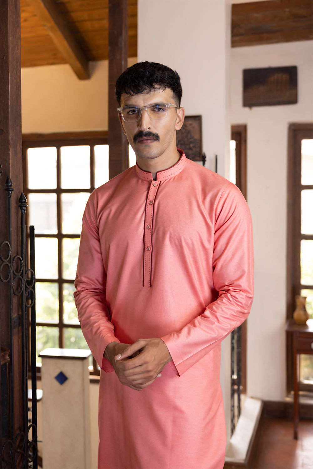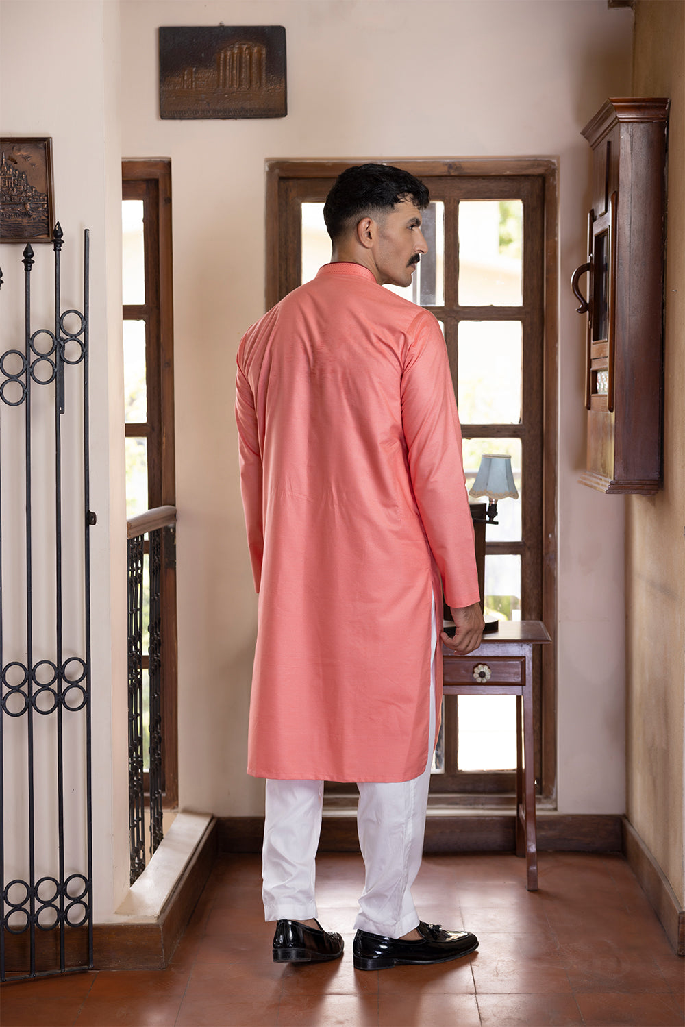 A refined kurta made from beige cotton silk fabric. Features semi-heavy embroidery on the collar, front and sleeves.