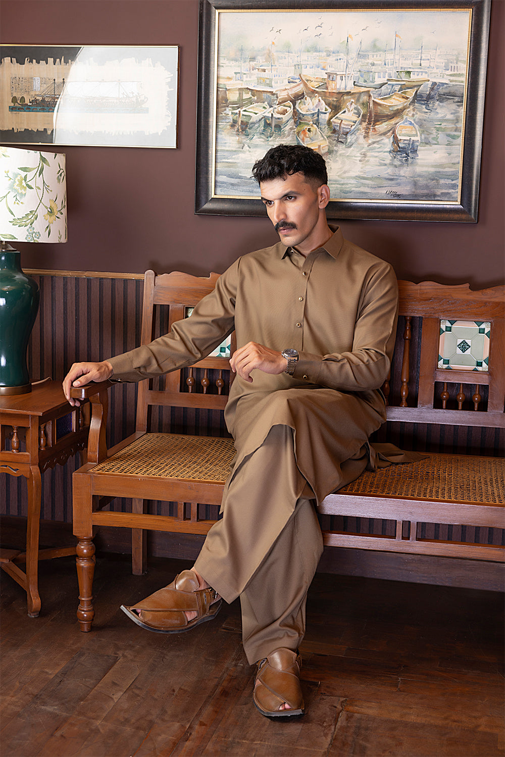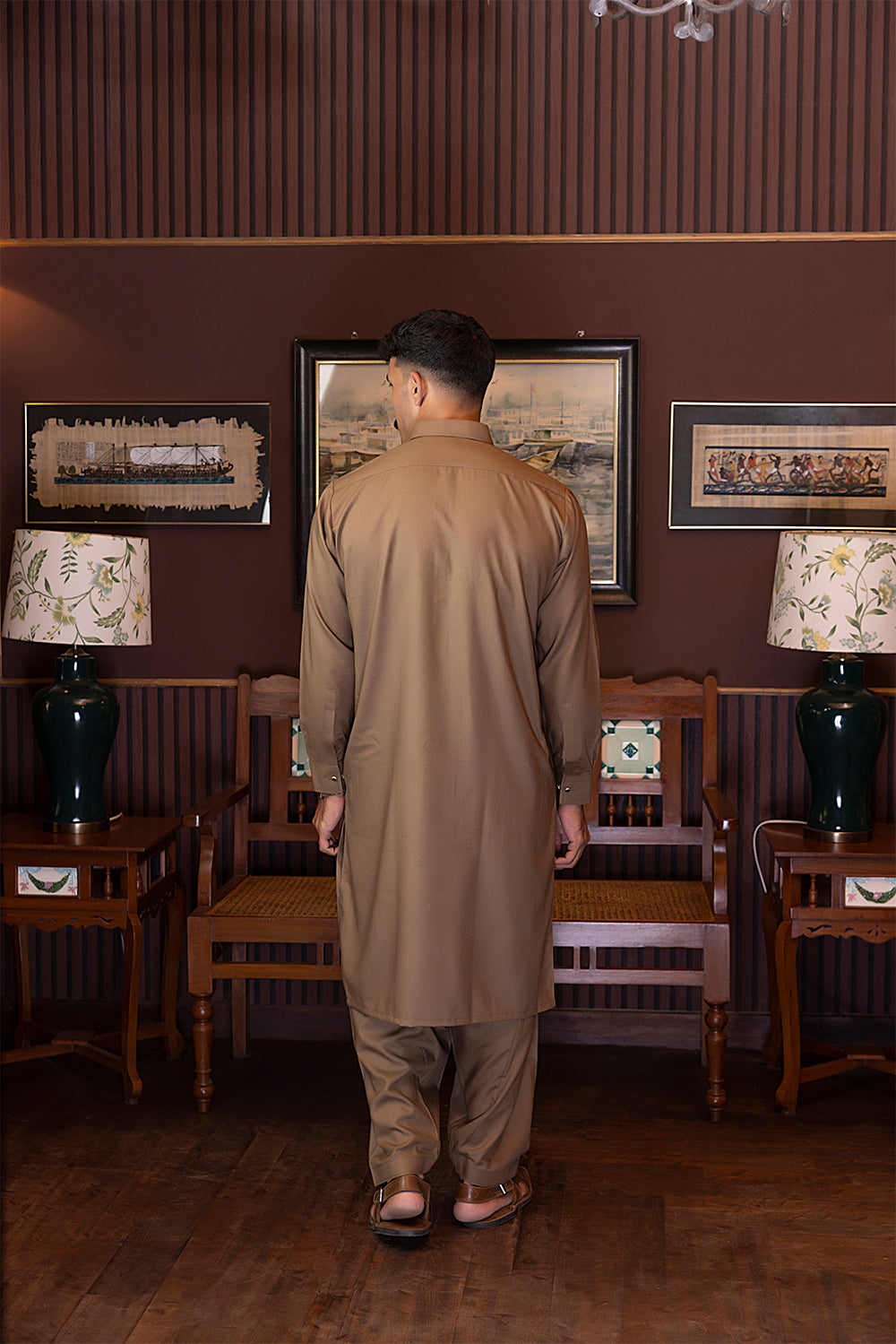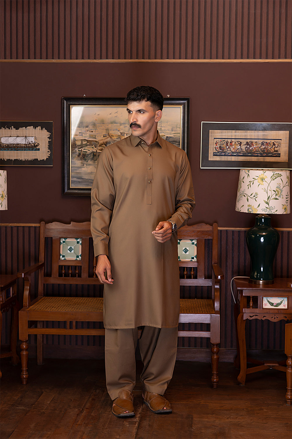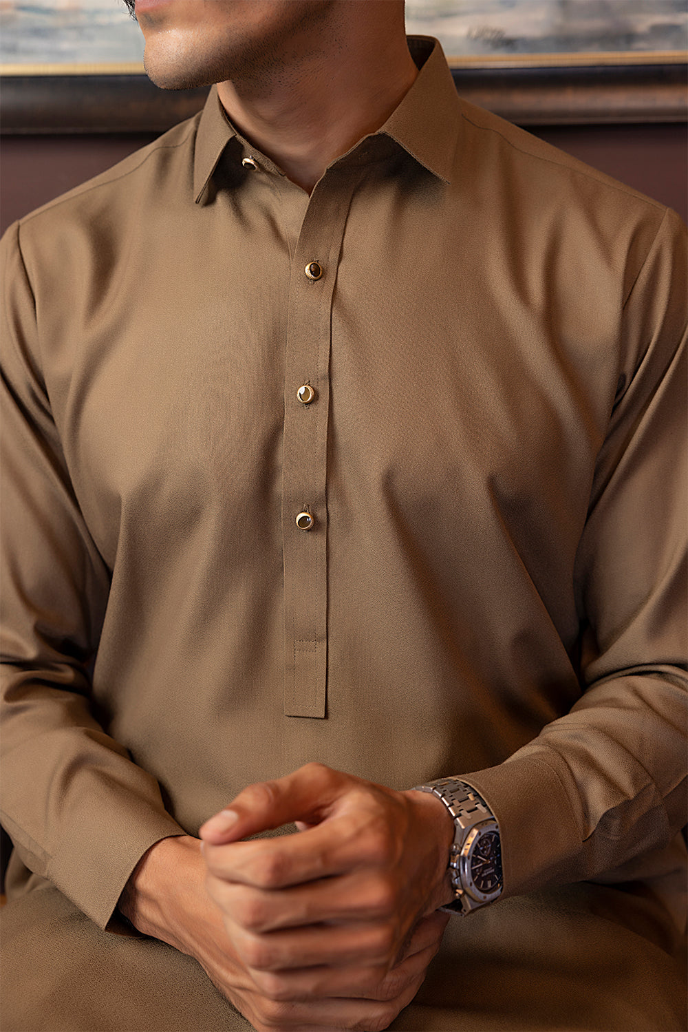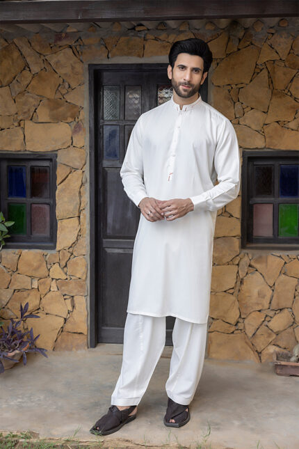 This trendy Wash & Wear Shalwar Kameez features a unique band collar, providing a sophisticated touch to your wardrobe. Available in versatile colors such as brown, black, navy, and white, this piece offers both comfort and style. Elevate your look with this effortless and chic outfit.