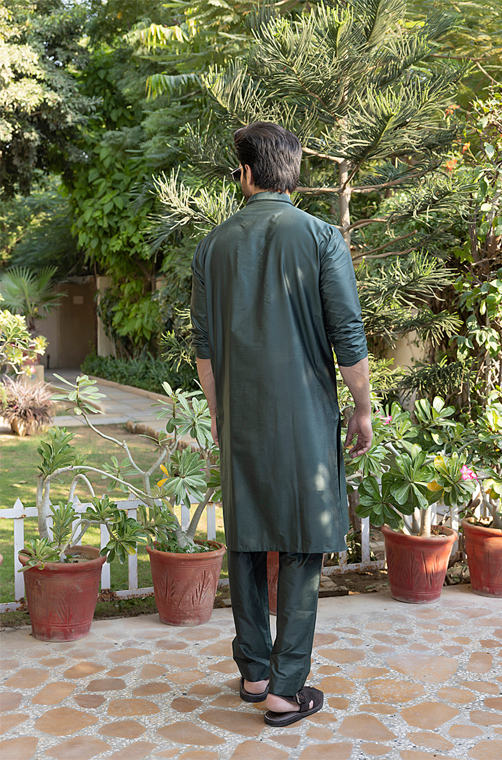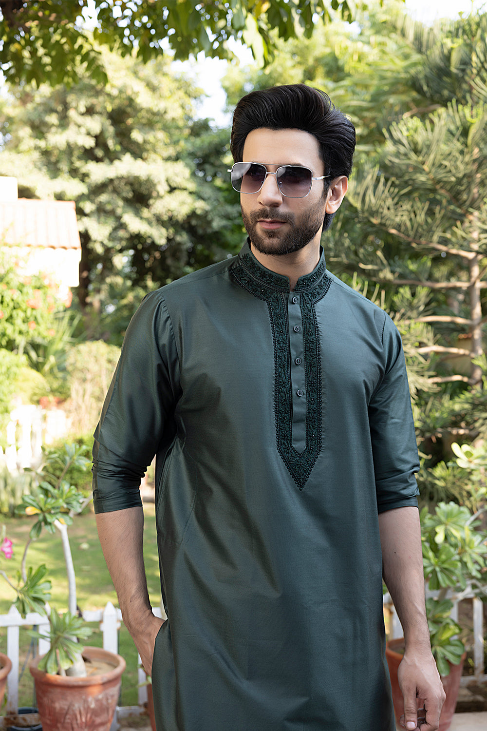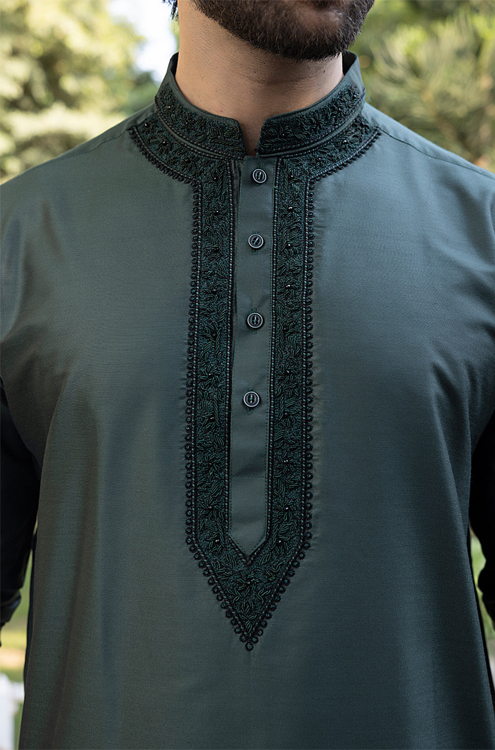 Green cotton silk kurta featuring embroidery along collar, neckline and. It is paired with a cotton silk pajama.