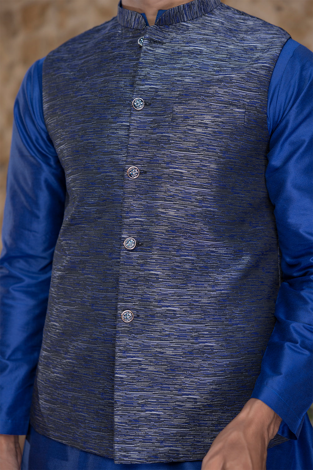 Traditional 3-piece suit set: Shalwar, Kameez, and Waistcoat for a complete look.