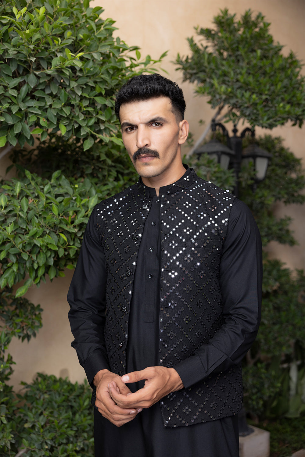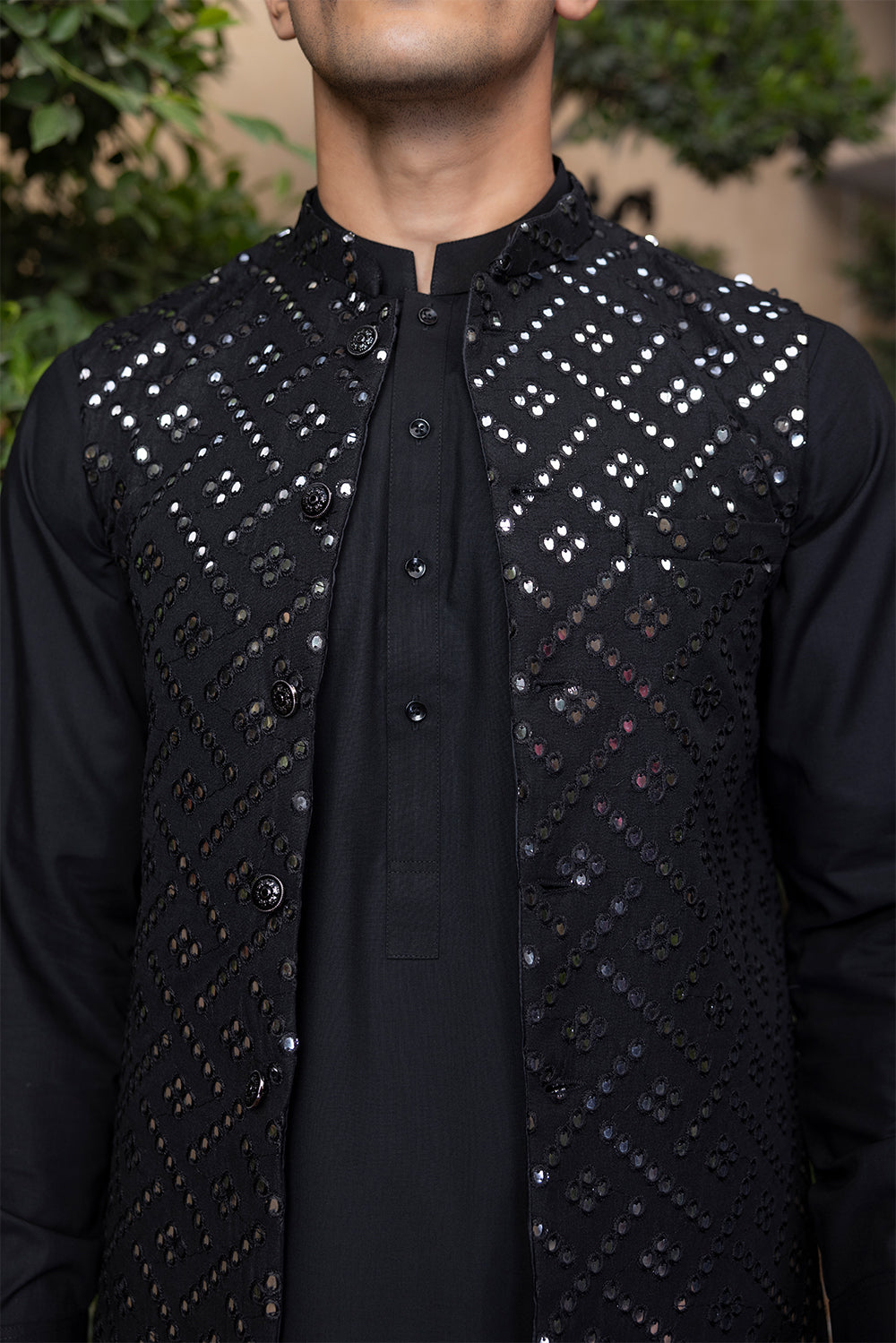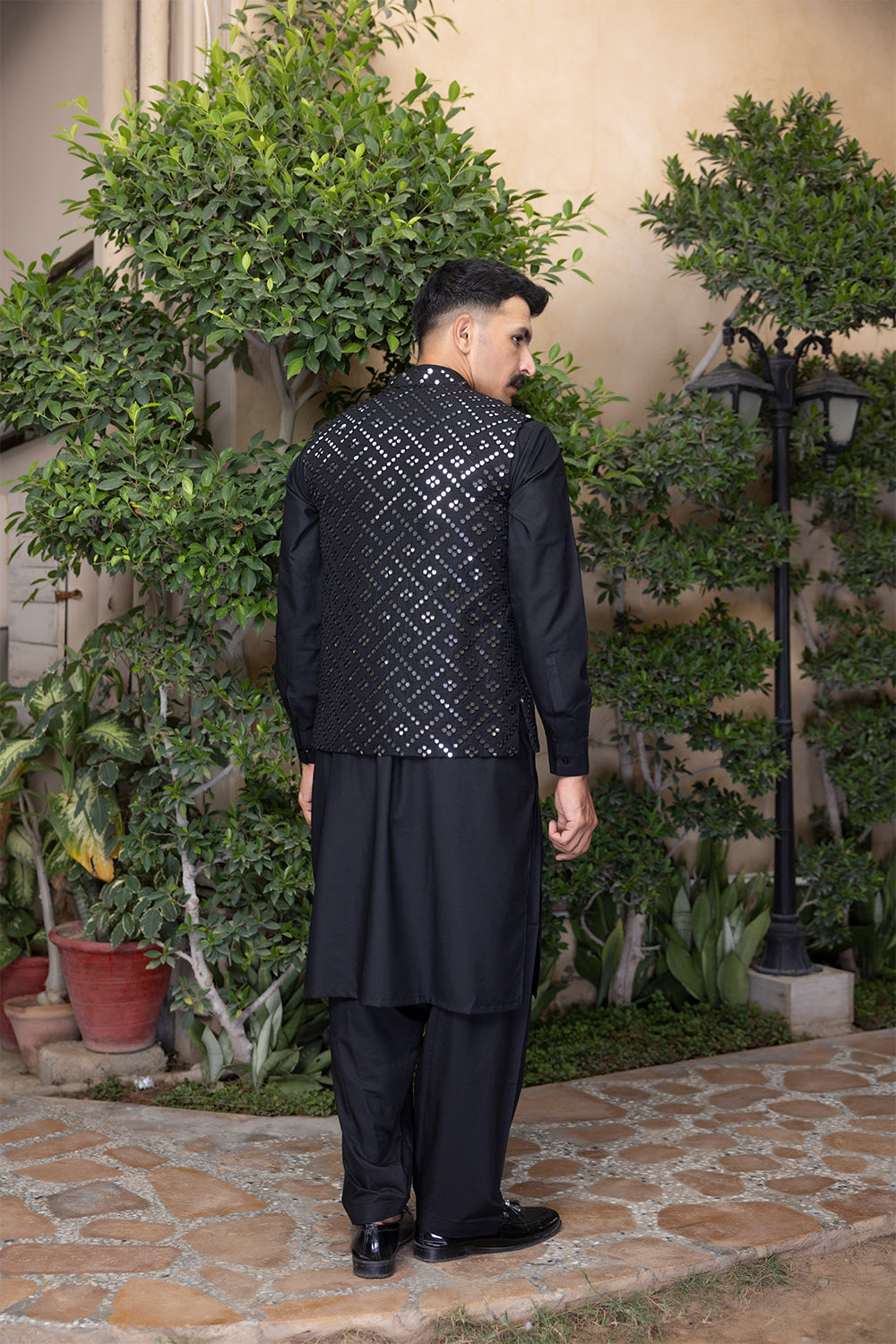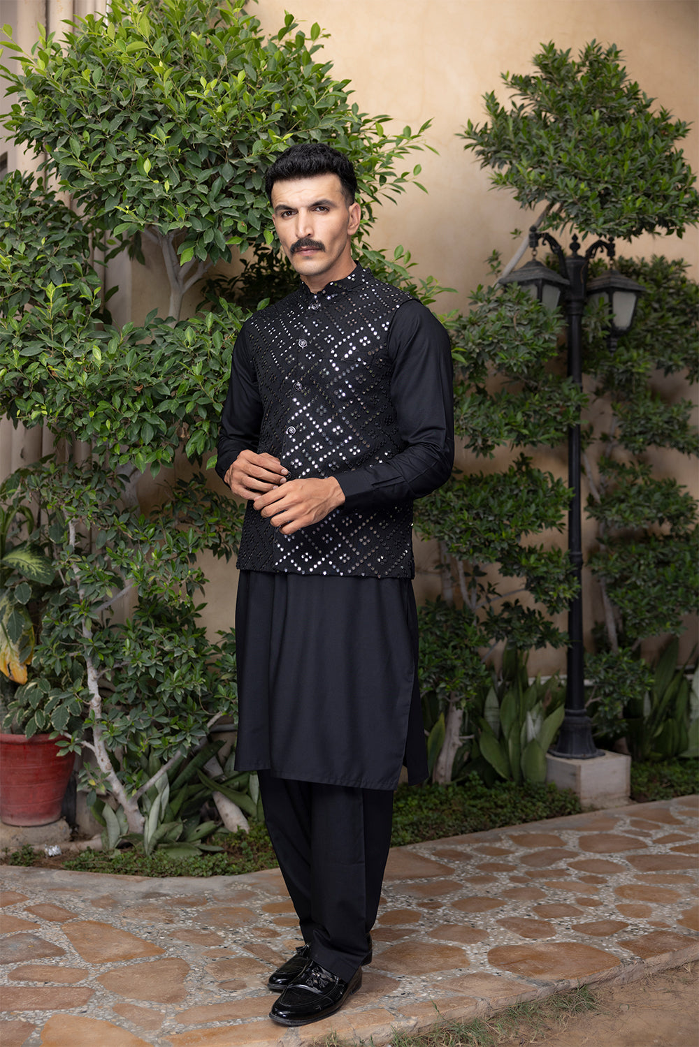 Traditional 3-piece suit set: Shalwar, Kameez, and Waistcoat for a complete look.